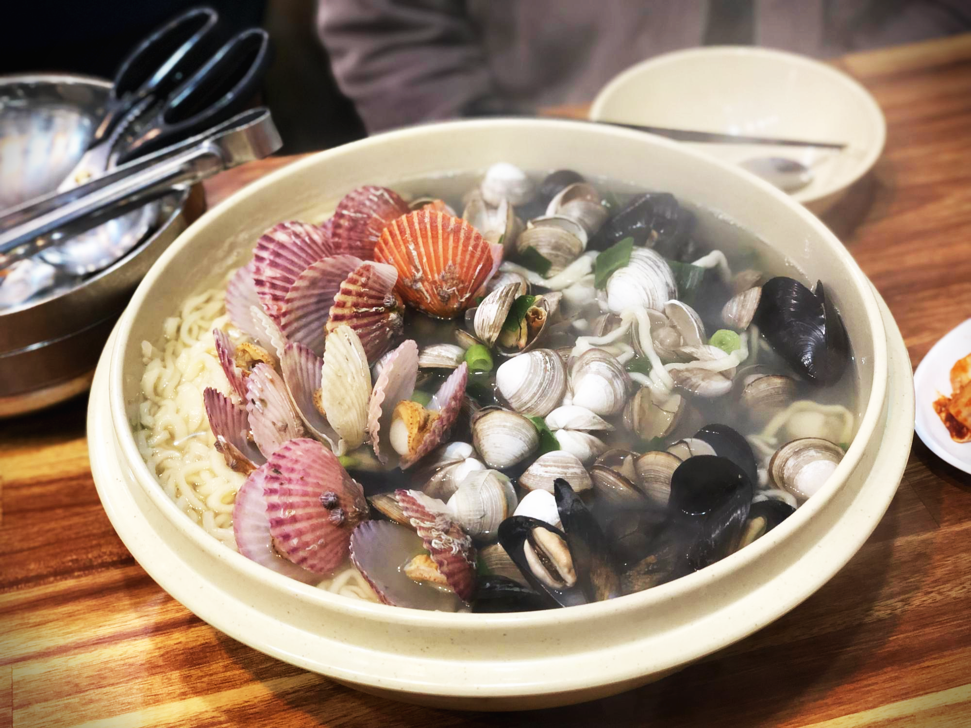 일반 해물칼국수에서는 쉽게 볼 수 없는 가리비와 물총조개가 들어있어요.